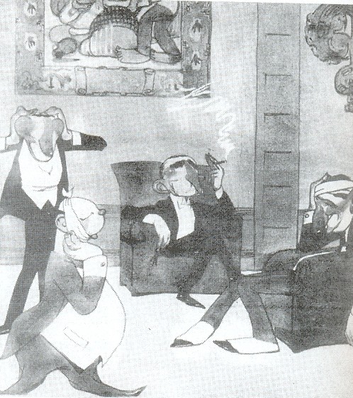 Caricatura del Gabinete Ministerial de Leguía, exhaustos después de las fiestas del Centenario, revista Mundial (1921)